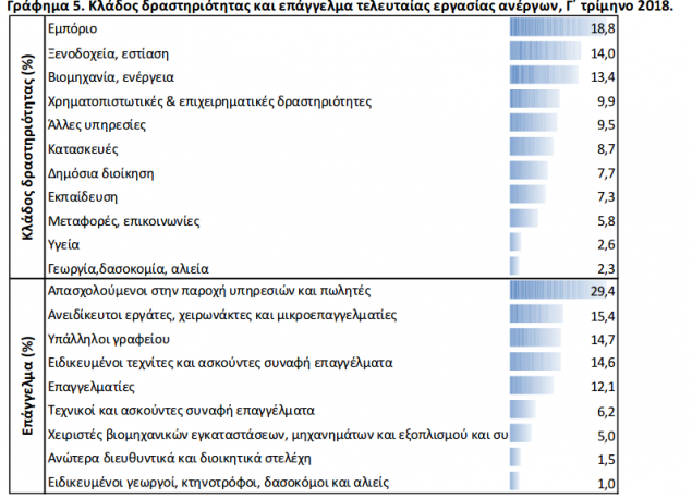 Αναλυτικά, κατά το Γ’ τρίμηνο του 2018 ο αριθμός των απασχολουμένων ανήλθε σε 3.894.184 άτομα και των ανέργων σε 871.756 άτομα. Η απασχόληση αυξήθηκε κατά 0,9%, σε σχέση με το προηγούμενο τρίμηνο και κατά 1,8%, σε σχέση με το αντίστοιχο τρίμηνο του προηγούμενου έτους.