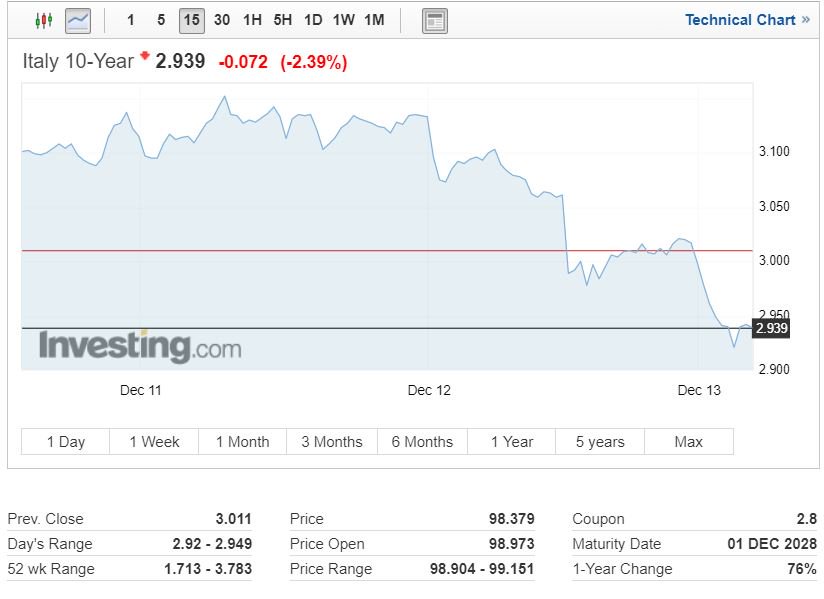 Οι αποδόσεις των βραχυπρόθεσμων ιταλικών ομολόγων σημείωσαν πτώση 12 μονάδων βάσης στο 0,47%, σε χαμηλό εξαμήνου, και κάτω από τα επίπεδα της 29ης Μαΐου, η οποία ήταν η χειρότερη ημέρα για τους διετείς ιταλικούς τίτλους εδώ και 25 χρόνια.