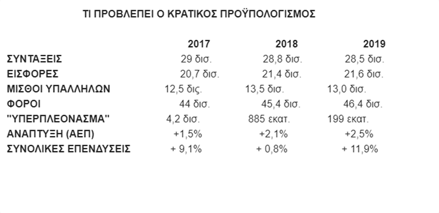 4. Την ίδια στιγμή, τα έσοδα του Κράτους από φόρους πρέπει να αυξάνονται συνεχώς κατά 1-1,5 δισ. το χρόνο. Από 44 δισ. τα 2017 σε 45,4 δισ. το 2018 και με πρόβλεψη να φτάσουν στα 46,4 δισ. ευρώ το 2019 (+1 δισ. ευρώ σε σχέση με φέτος).