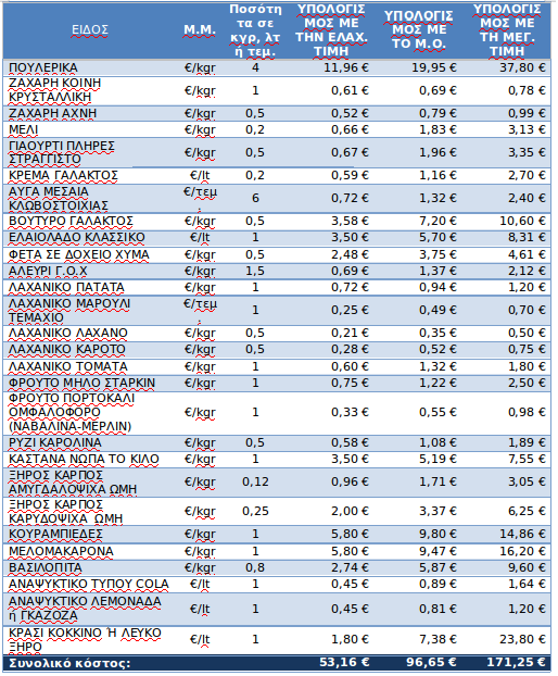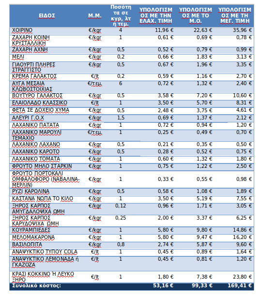 Δεν υπάρχει μεγάλη διαφορά στο συνολικό κόστος των δύο τυπικών καλαθιών (με πουλερικά ή χοιρινό). Το κόστος για το τυπικό καλάθι με πουλερικά ανέρχεται κατά μέσο όρο σε 96,65 €, ενώ για το τυπικό καλάθι με χοιρινό ανέρχεται σε 99,33 €.