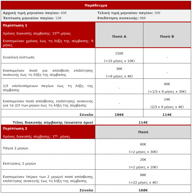 Το ποσό Β ανέρχεται στα 114 ευρώ (το 1/3 των υπολειπόμενων παγίων, συν το ποσό απόσβεσης επιδότησης για τα 2/3 του εναπομείναντος διαστήματος των 9 μηνών). Συνεπώς, δεδομένου ότι το ποσό Β είναι το μικρότερο, το τέλος διακοπής σύμβασης με το οποίο θα επιβαρυνθεί ο συνδρομητής δεν πρέπει να υπερβαίνει τα 114 ευρώ (βλ. πίνακα, Περίπτωση 1).
