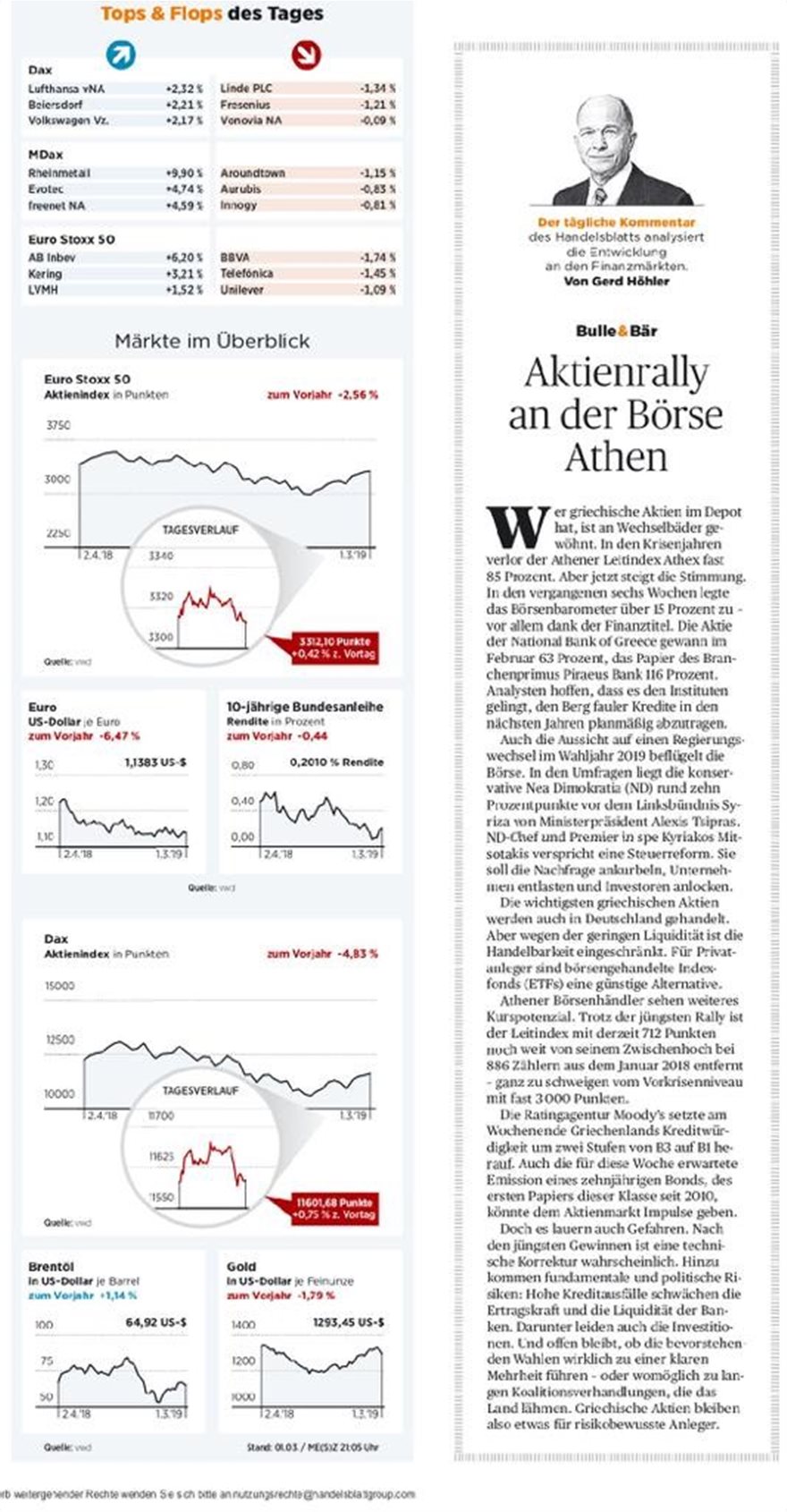 Αφού Gerd Höhler, σημειώνει ότι υπάρχει «ράλι μετοχών στο χρηματιστήριο Αθηνών», αναφέρει ότι «οι χρηματιστές στην Αθήνα πιστεύουν ότι το κλίμα μπορεί να βελτιωθεί περαιτέρω. Εξάλλου η Moody’s αναβάθμισε το αξιόχρεο της Ελλάδας κατά δύο βαθμίδες. Αλλά και η αναμενόμενη εντός της εβδομάδας έκδοση δεκαετούς ομολόγου αναμένεται να δώσει νέα ώθηση στην χρηματιστηριακή αγορά».
