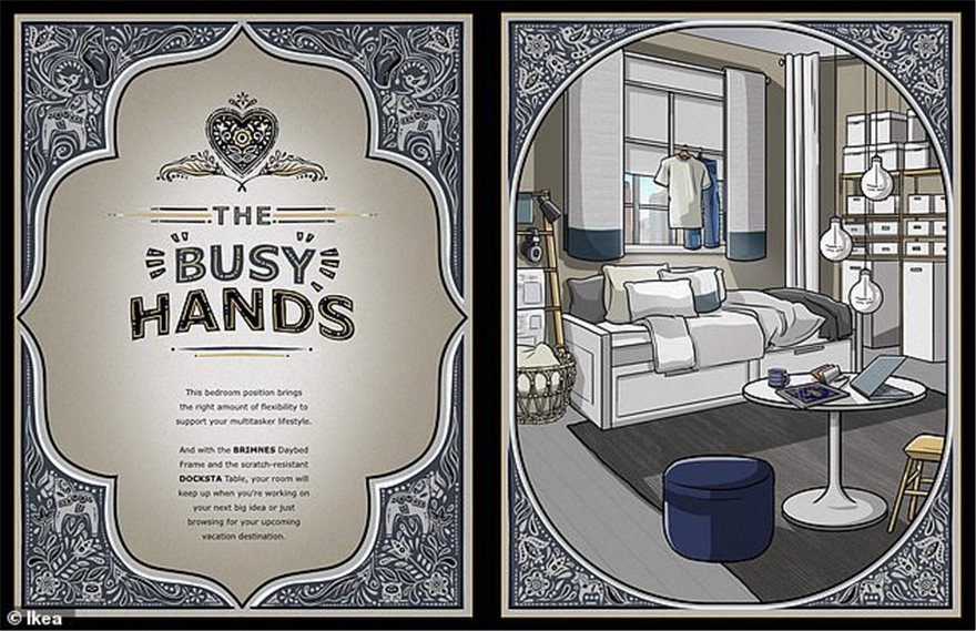 Οι «λύσεις» που περιλαμβάνει όσον αφορά στη διαμόρφωση του πιο προσωπικού χώρου του σπιτιού φέρουν ονόματα που παραπέμπουν σε σεξουαλικές στάσεις. «Αισθάνεστε ανήσυχοι ή ανικανοποίητοι; Μην ανησυχείτε, έχουμε την ιδανική στάση για εσάς. Και όταν λέμε «στάση» εννοούμε «λύση», που θα διώξει την πλήξη από την κρεβατοκάμαρά σας», αναφέρει το «Κάμα Σούτρα» της ΙΚΕΑ.