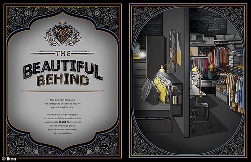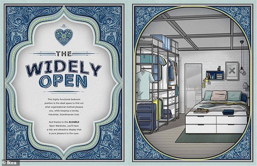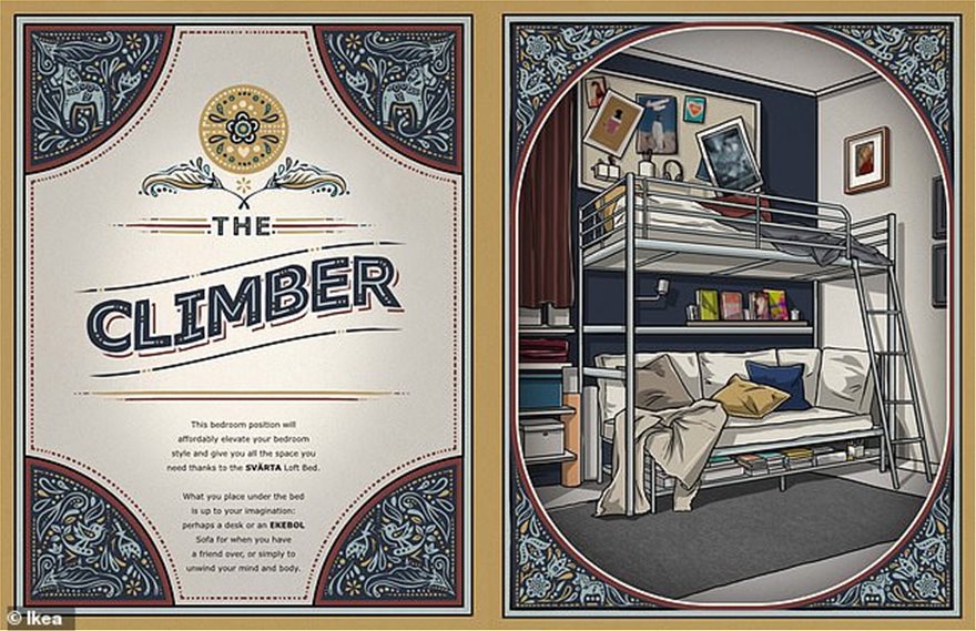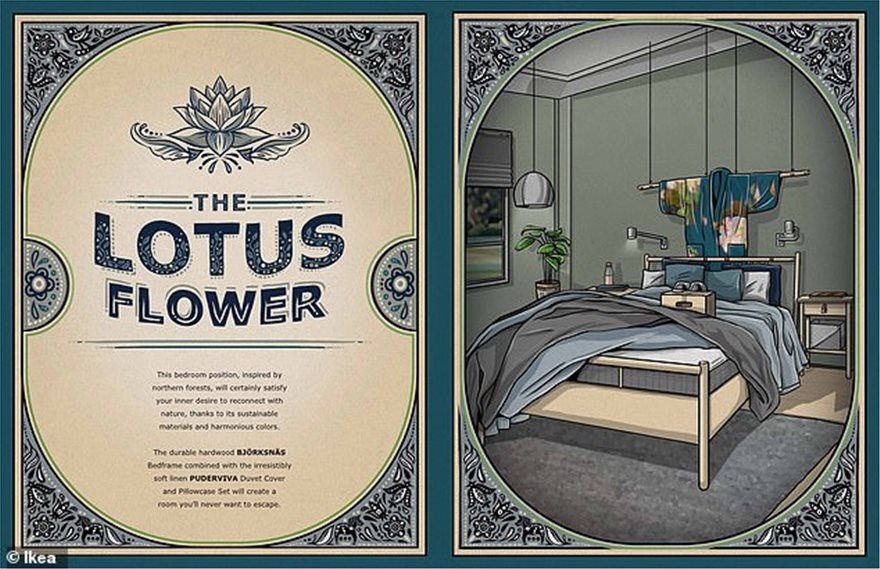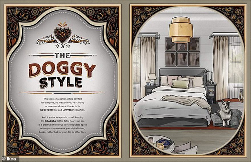 Οι «λύσεις» που περιλαμβάνει όσον αφορά στη διαμόρφωση του πιο προσωπικού χώρου του σπιτιού φέρουν ονόματα που παραπέμπουν σε σεξουαλικές στάσεις. «Αισθάνεστε ανήσυχοι ή ανικανοποίητοι; Μην ανησυχείτε, έχουμε την ιδανική στάση για εσάς. Και όταν λέμε «στάση» εννοούμε «λύση», που θα διώξει την πλήξη από την κρεβατοκάμαρά σας», αναφέρει το «Κάμα Σούτρα» της ΙΚΕΑ.