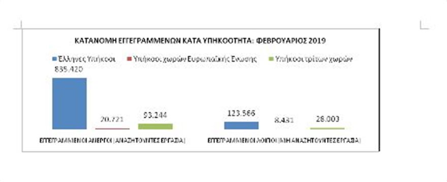 Το σύνολο των εγγεγραμμένων ανέργων, με κριτήριο την αναζήτηση εργασίας για τον μήνα Φεβρουάριο 2019, ανήλθε σε 949.385 άτομα έναντι 898.682 ατόμων τον αντίστοιχο μήνα του 2018 . Από αυτά το 50,82% είναι μακροχρόνια άνεργοι.