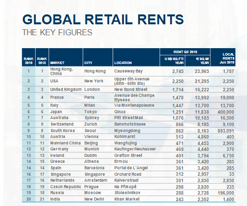 Η Causeway Bay στο Χονγκ Κονγκ διατήρησε τη θέση της ως η ακριβότερη εμπορική πιάτσα στον κόσμο για το 2019 με τις τιμές των ενοικίων να προσεγγίζουν τα 26.000 ευρώ ανά τετραγωνικό μέτρο το χρόνο ή αλλιώς κοντά στα 2.160 ευρώ ανά τ.μ. το μήνα.