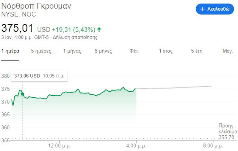 Οι μετοχές των κατασκευαστών όπλων έκλεισαν με σημαντικές αυξήσεις την περασμένη Παρασκευή, λίγες ώρες μετά την εκτέλεση του Κασέμ Σουλεϊμανί στο Ιράκ. Συγκεκριμένα, η μετοχή της Lockheed Martin έκλεισε με αύξηση της τάξης του 3,6%, της Northrop Grumman -που ετοιμάζει το B-21, ένα stealth βομβαρδιστικό νέας γενιάς για τις ΗΠΑ- με 5,43%, της Raytheon με αύξηση 1,5% και της General Dynamics με +1%.