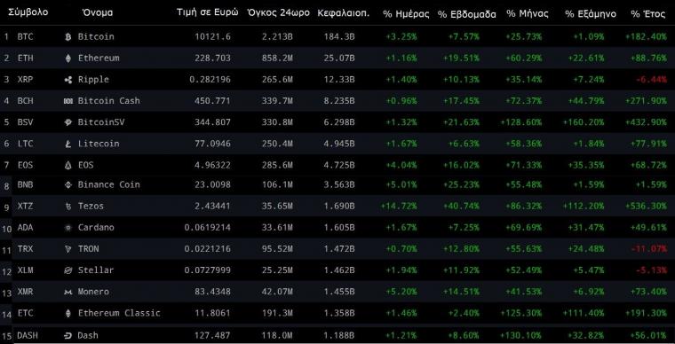 Στον πίνακα που παρατίθεται παρακάτω εμφανίζονται οι συναλλαγές –όλες σε πράσινο χρώμα- που καταγράφουν το θετικό κλίμα που επικράτησε, παρασύροντας και άλλα κρυπτονομίσματα σε ανοδική πορεία.