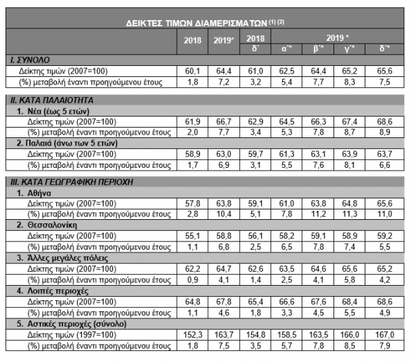 Τέλος, για το σύνολο των αστικών περιοχών της χώρας, το δ΄ τρίμηνο του 2019 οι τιμές των διαμερισμάτων αυξήθηκαν κατά 7,9% σε σύγκριση με το δ΄ τρίμηνο του 2018, ενώ για το 2019 η μέση ετήσια αύξηση διαμορφώθηκε σε 7,5%.