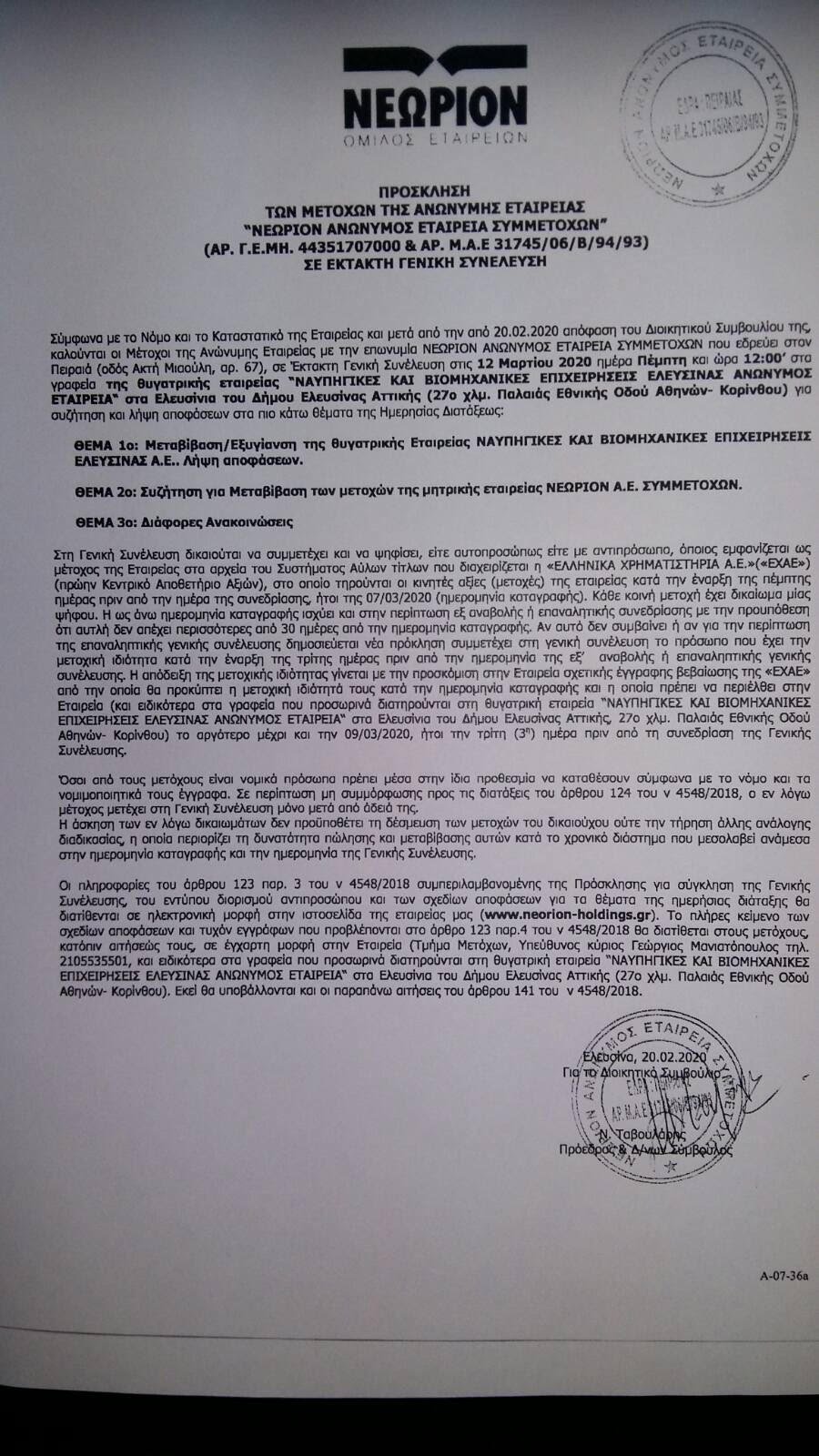 -Συζήτηση για Μεταβίβαση των μετοχών της μητρικής εταιρείας ΝΕΩΡΙΟΝ ΑΕ ΣΥΜΜΕΤΟΧΩΝ