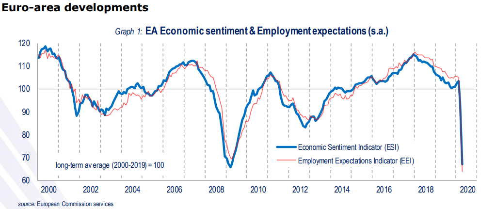 Το ευρωπαϊκό οικονομικό κλίμα είναι τώρα κοντά στα χαμηλά που καταγράφηκαν κατά τη διάρκεια της χρηματοπιστωτικής κρίσης. Ο συνολικός δείκτης, που χρονολογείται από το 1985, υποχώρησε στο 67 από 94,2 τον Μάρτιο, ελάχιστα πάνω από το ιστορικό χαμηλό του 2009 (65,5).