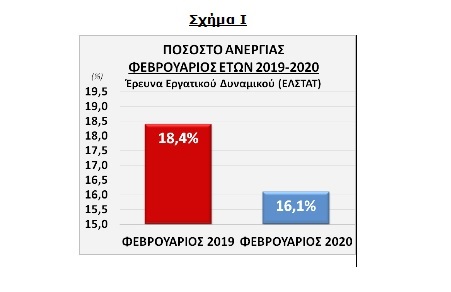 Συγκεκριμένα, το ποσοστό ανεργίας ανήλθε στο 16,1% έναντι 18,4% του Φεβρουάριο 2019, μείωση ―2,3%. Ο συνολικός αριθμός των απασχολουμένων, για τον μήνα Φεβρουάριο 2020, παρουσίασε αύξηση κατά 0,4% και ανήλθε στα 3.888.595 άτομα, έναντι 3.874.144 το 2019.