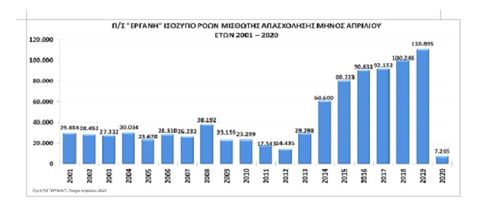Σύμφωνα με την ανακοίνωση του υπουργείου Εργασίας, «τα αποτελέσματα του πληροφοριακού συστήματος ΕΡΓΑΝΗ για τον μήνα Απρίλιο 2020 επιβεβαιώνουν τις αναμενόμενες αρνητικές επιπτώσεις στην αγορά εργασίας μετά την εκδήλωση της πρωτοφανούς και παγκόσμιου χαρακτήρα πανδημίας του κορωνοϊού COVID-19 που δοκιμάζει και τη χώρα μας.