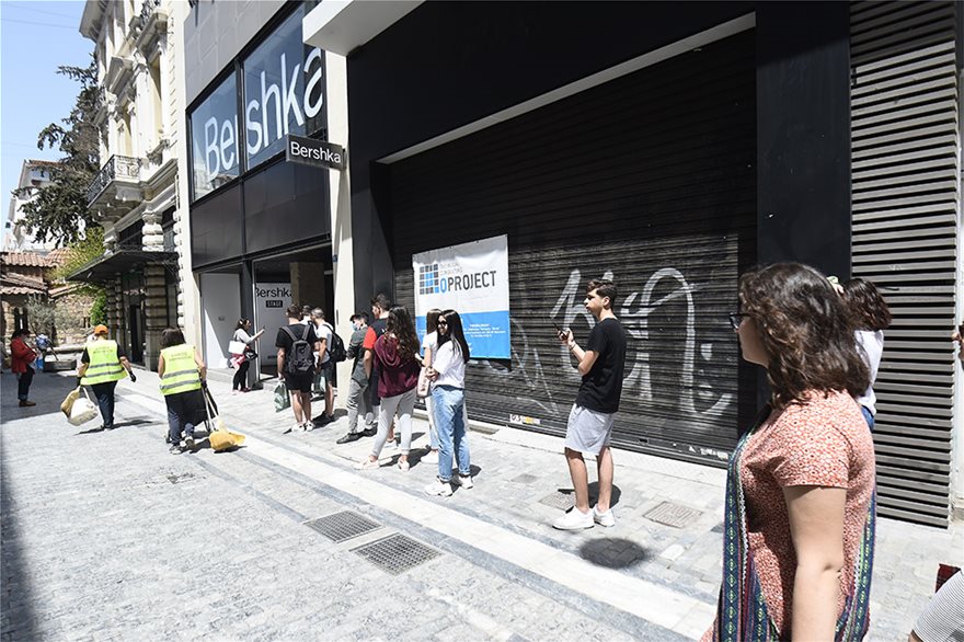 Η Ερμού, ο εμπορικότερος δρόμος της Αθήνας γέμισε από κόσμο με ουρές να σχηματίζονται έξω από τα καταστήματα και αρκετούς εκ των καταναλωτών να φορούν μάσκες.