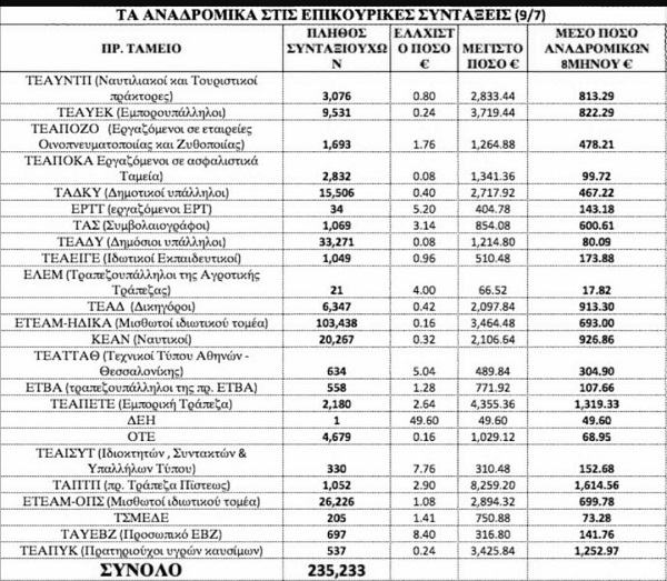 Τα ποσά που θα λάβουν κυμαίνονται κατά μέσο όρο από 17 ευρώ έως και πάνω από 1.600 ευρώ ενώ υπάρχουν περιπτώσεις που φτάνουν 8.259 για την περίοδο από τον Οκτώβριο του 2019 έως το Μάιο του 2020. Δικαιούχοι των αναδρομικών είναι οι συνταξιούχοι που είδαν αύξηση για πρώτη φορά στην πληρωμή των επικουρικών στις 2 Ιουνίου και η αύξηση μετράει από 1η Οκτωβρίου 2019,
