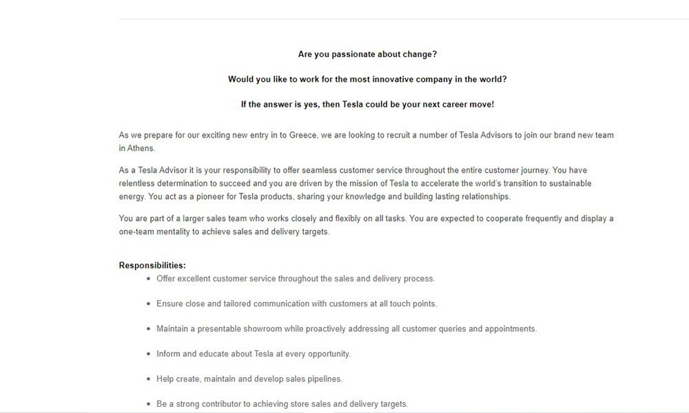 Όπως μπορούμε λοιπόν να δούμε και πάλι στο επίσημο site της εταιρείας, η Tesla αναφέρει ξεκάθαρα ότι προετοιμάζεται για την «συναρπαστική» νέα είσοδό της στην Ελλάδα, εξ ου άλλωστε και βρίσκεται σε αναζήτηση συνεργατών σε 2 τμήματα, έναν στο κομμάτι της Διεύθυνσης Πωλήσεων και Παράδοσης Αυτοκινήτων, καθώς και μια σειρά από νέους «Σύμβουλους Tesla» (Tesla Advisor) που θα αναλάβουν το customer support.