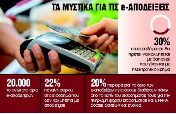 1 Το απαιτούμενο ποσό δαπανών με ηλεκτρονικά μέσα πληρωμής για κάθε φορολογικό έτος ορίζεται σε 30% του πραγματικού εισοδήματος, που προκύπτει στην ημεδαπή ή/και στην αλλοδαπή και προέρχεται από μισθωτή εργασία και συντάξεις, από επιχειρηματική δραστηριότητα και από ακίνητη περιουσία και μέχρι 20.000 ευρώ δαπανών.