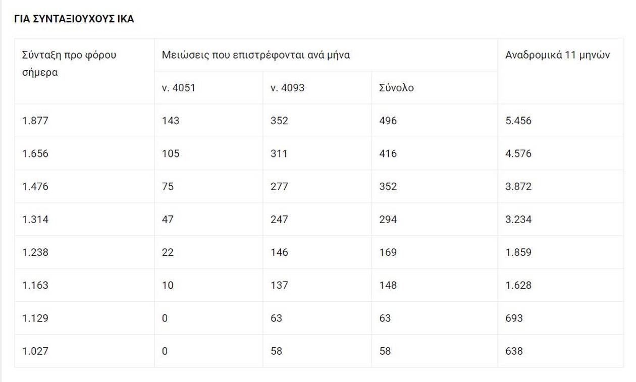 Οι διπλοσυνταξιούχοι παίρνουν αναδρομικά και στις δύο ή τρεις κύριες συντάξεις εφόσον ξεπερνούν σε άθροισμα τα 1.000 ευρώ, γιατί πάνω από το ποσό αυτό είχαν τις μειώσεις του νόμου 4093. Για παράδειγμα, συνταξιούχος του ΙΚΑ που παίρνει 850 ευρώ σύνταξη γήρατος και άλλα 300 ευρώ από σύνταξη χηρείας του Δημοσίου έχει άθροισμα 1.150 ευρώ και με τον νόμο 4093 είχε μείωση 5% και στα δύο ποσά γιατί υπερέβαινε τα 1.000 ευρώ. Οπότε, θα πάρει αναδρομικά 42,5 ευρώ τον μήνα για 11 μήνες, ήτοι 468 ευρώ για τη σύνταξη του ΙΚΑ και 165 ευρώ για τη σύνταξη του Δημοσίου, δηλαδή σύνολο αναδρομικών 633 ευρώ.