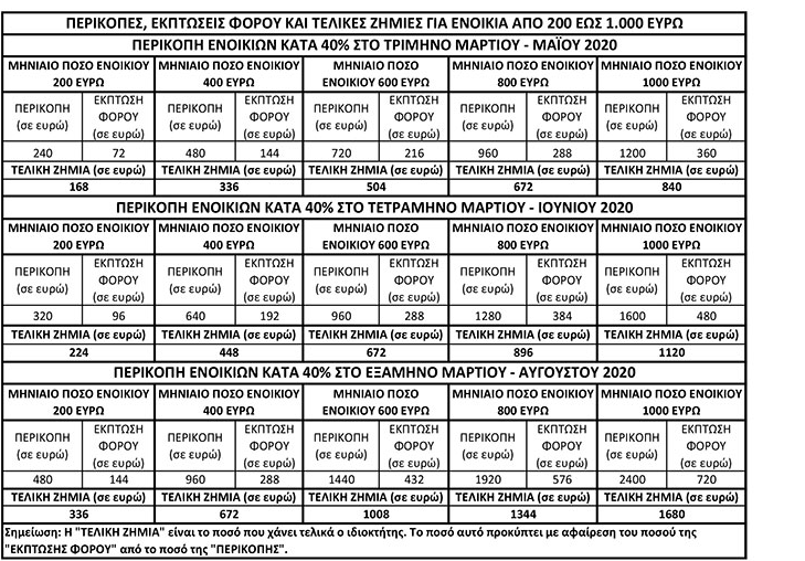 Όσον αφορά στους ιδιοκτήτες εκμισθούμενων ακινήτων που αναγκάζονται να αποδεχθούν την είσπραξη ενοικίων μειωμένων κατά 40%, η ισχύουσα νομοθεσία προβλέπει επιπλέον ότι: