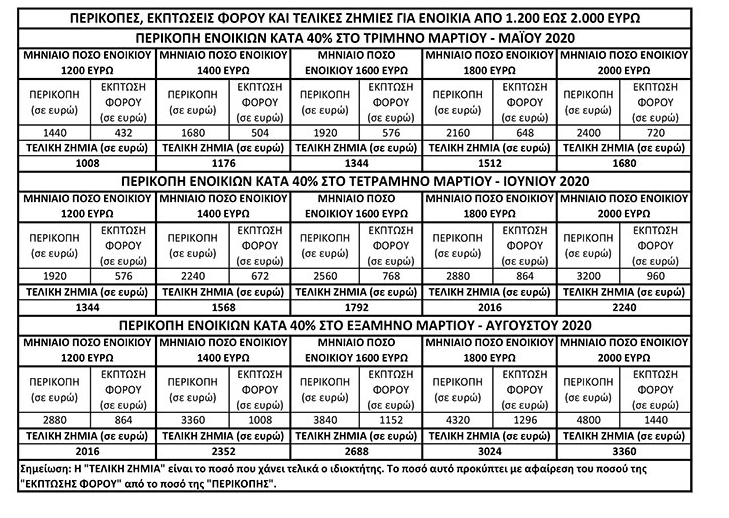 Σύμφωνα με τα όσα προβλέπουν οι έκτακτες ρυθμίσεις της κυβέρνησης για τα μέτρα οικονομικής στήριξης νοικοκυριών και επιχειρήσεων πληττομένων από τον κορωνοϊό, οι ιδιοκτήτες ακινήτων οι οποίοι υποχρεούνται να αποδεχθούν περικοπές 40% στα εισπραττόμενα ενοίκια δικαιούνται έκπτωση, από φορολογικές οφειλές με καταληκτική ημερομηνία πληρωμής από 31-7-2020 και μετά (δηλαδή από φόρο εισοδήματος ή και ΕΝΦΙΑ του τρέχοντος έτους), ποσοστού 20% υπολογιζόμενου επί του τμήματος των μισθωμάτων το οποίο εισπράττουν τελικά, μετά την αναγκαστική μείωση κατά 40%. Δηλαδή δικαιούνται έκπτωση φόρου ίση με ποσοστό 20% επί του 60% των μισθωμάτων.