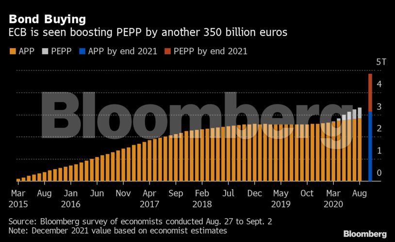 Το πρόγραμμα αγοράς ομολόγων έκτακτης ανάγκης για την πανδημία πρόκειται να παραμείνει σε ισχύ μέχρι τα μέσα του επόμενου έτους και οι οικονομολόγοι προβλέπουν ότι θα προστεθούν άλλα 350 δισεκατομμύρια ευρώ έως τον Δεκέμβριο. Αναμένουν επίσης ότι οι αγορές θα παραταθούν κατά έξι επιπλέον μήνες.