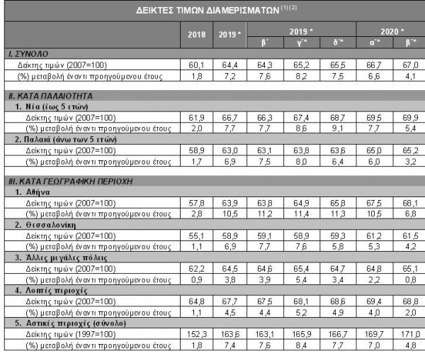 Με βάση τα αναθεωρημένα στοιχεία, το α΄ τρίμηνο του 2020 σημειώθηκε αύξηση των τιμών των “νέων” διαμερισμάτων κατά 7,7%, ενώ οι τιμές των “παλαιών” διαμερισμάτων αυξήθηκαν κατά 6,0% σε σύγκριση με το αντίστοιχο τρίμηνο του 2019. Για το σύνολο του 2019, οι τιμές για τα “νέα” και τα “παλαιά” διαμερίσματα αυξήθηκαν με μέσο ετήσιο ρυθμό 7,7% και 6,9% αντίστοιχα.