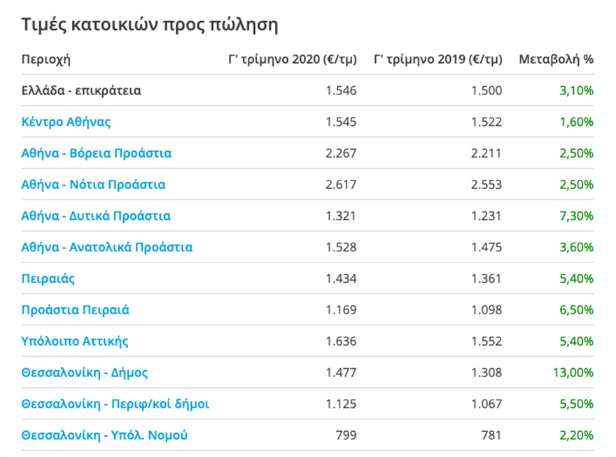 Για τα στατιστικά σε πανελλαδικό επίπεδο, κατά τη διάρκεια του Ιουλίου-Αυγούστου-Σεπτεμβρίου 2020, η μέση τιμή για τα σπίτια προς πώληση ήταν υψηλότερη στα νότια προάστια, με 2.617 ευρώ ανά τετραγωνικό μέτρο με άνοδο 2,5% -εξέλιξη, η οποία δεν αποτελεί έκπληξη, αφού ακολουθεί σταθερά την τάση των τελευταίων ετών- και χαμηλότερη στη Φλώρινα με 545€ ανά τ.μ..