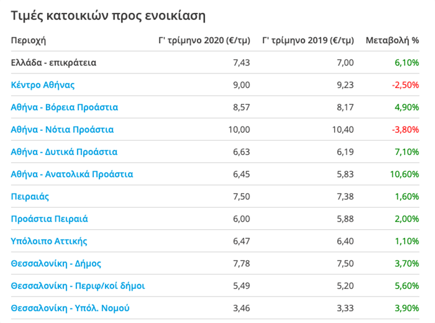 Επίσης, και στα δυτικά προάστια οι τιμές έχουν πάρει την ανιούσα σε ποσοστό 7,1% και μία μέση τιμή που φθάνει στα 6,63 ευρώ ανά τ.μ.. Στο +4,9% είναι οι τιμές ενοικίασης στα βόρεια προάστια (8,57 ευρώ ανά τ.μ.).