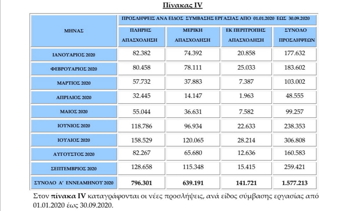 Αθροιστικά για την περίοδο Ιανουάριος – Σεπτέμβριος 2020, οι αναγγελίες προσλήψεων ανήλθαν στις 1.577.213 θέσεις εργασίας και οι αποχωρήσεις έφτασαν τις 1.423.037, εκ των οποίων οι 821.461 ήταν αποτέλεσμα καταγγελιών συμβάσεων αορίστου χρόνου ή λήξεων συμβάσεων ορισμένου χρόνου και οι 601.576 οικειοθελείς αποχωρήσεις.
