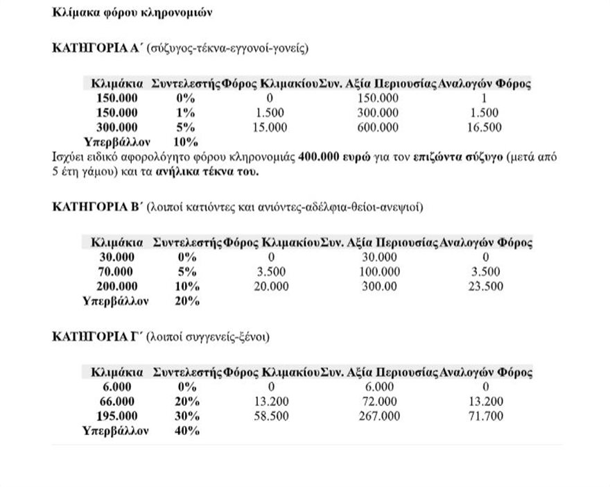 Για τους συζύγους, τα παιδιά και τα εγγόνια το αφορολόγητο όριο διαμορφώνεται στα 150.000 ευρώ. Εάν η συνολική άξια της κληρονομιάς (δηλαδή μαζί με τα αναδρομικά) δεν ξεπερνά το συγκεκριμένο όριο τότε και τα αναδρομικά θα είναι αφορολόγητα. Αλλιώς θα φορολογηθούν βάσει κλίμακας (βλ. πίνακα).