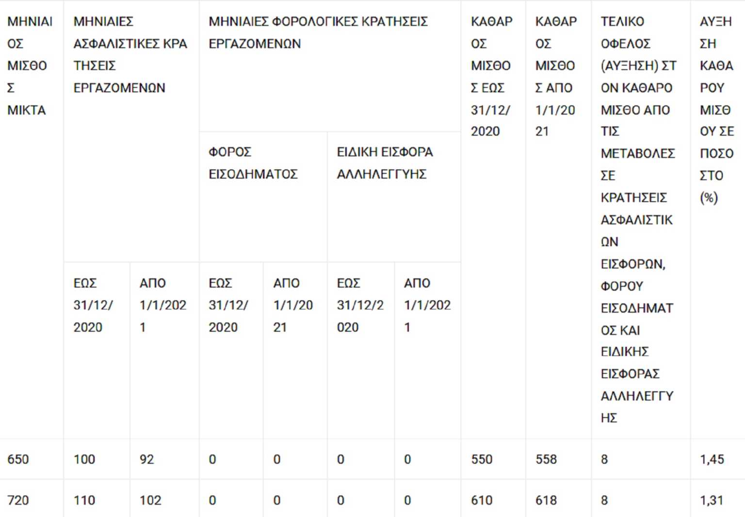 Από τα παραδείγματα του πίνακα τα οποία αφορούν εργαζομένους χωρίς εξαρτώμενα τέκνα προκύπτει ότι από την 1η-1-2021:
