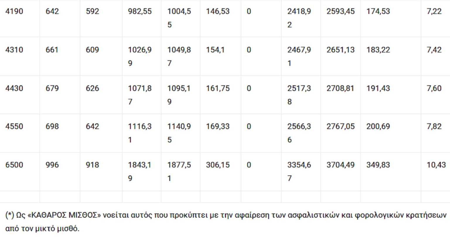 4. Εν τέλει, οι εργαζόμενοι στον ιδιωτικό τομέα με μικτές μηνιαίες αποδοχές από 650 έως 6.500 ευρώ, οι οποίες αντιστοιχούν σήμερα σε καθαρές μηνιαίες αποδοχές από 550 έως 3.354,67 ευρώ (μετά την αφαίρεση των μηνιαίων κρατήσεων ασφαλιστικών εισφορών, φόρου εισοδήματος και ειδικής εισφοράς αλληλεγγύης) θα λάβουν επί των καθαρών μηνιαίων αποδοχών τους αυξήσεις που θα κυμαίνονται σε ποσοστά από 1,45% έως και 10,43% και σε ποσά από 8 έως και 349,83 ευρώ. Ετσι, από τον Ιανουάριο του 2021, οι καθαρές μηνιαίες αποδοχές τους θα κυμαίνονται πλέον από 558 έως 3.794,49 ευρώ!