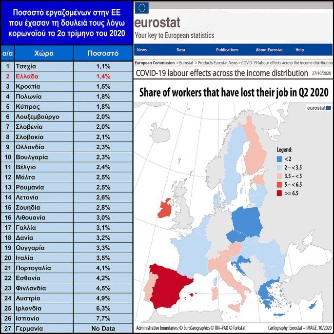 Σύμφωνα με τα στοιχεία που έδωσε στη δημοσιότητα η Eurostat και μετά την Τσεχία, η Ελλάδα είχε τις λιγότερες απώλειες θέσεων εργασίας εν μέσω πανδημίας και ήταν μία από τις πλέον αποτελεσματικές ευρωπαϊκές χώρες:
