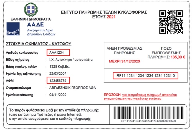 Σε περίπτωση που το κινητό τηλέφωνο δεν έχει τη δυνατότητα σάρωσης, τότε απλά συμπληρώνετε τα στοιχεία στο e-banking, όπως ακριβώς φαίνονται στο ειδοποιητήριο των τελών κυκλοφορίας. Το νέο ειδοποιητήριο των τελών κυκλοφορίας, με τον QR code στο πάνω δεξιά τμήμα του: