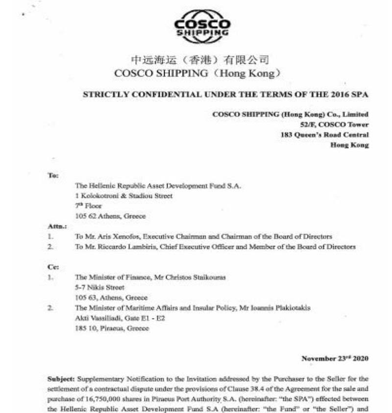 Πριν από τρεις ημέρες στις 23 Νοεμβρίου η Cosco Shipping με επιστολή της επιρρίπτει ευθύνες στο Ελληνικό Δημόσιο για την μέχρι σήμερα αποτυχία υλοποίησης των Υποχρεωτικών Επενδύσεων, τις οποίες η κινέζικη εταιρεία είναι υποχρεωμένη να ολοκληρώσει το αργότερο μέχρι τον Αύγουστο 2021.