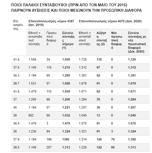 Ενας συνταξιούχος του 2008 με 40 έτη που θα έχει αύξηση 170 ευρώ με τον επανυπολογισμό, αλλά έχει και προσωπική διαφορά 70 ευρώ, θα πάρει στην τσέπη καθαρή αύξηση 100 ευρώ, γιατί τα 70 ευρώ θα ισοφαρίσουν την προσωπική διαφορά (σ.σ.: η προσωπική διαφορά δόθηκε, ώστε να παραμείνει η παλαιά σύνταξη και να μην ισχύσει η μείωση που έγινε με τον επανυπολογισμό του «νόμου Κατρούγκαλου»).