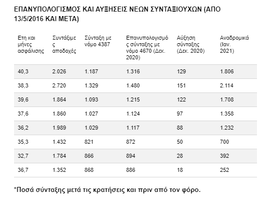 Ενας συνταξιούχος του 2017 με 40 έτη που θα έχει αύξηση 170 ευρώ με τον επανυπολογισμό θα την πάρει σε μία δόση με τη σύνταξη που θα πληρωθεί τον Ιανουάριο και επίσης σε μία δόση θα πάρει αναδρομικά αύξησης για 14 μήνες με ποσό 2.380 ευρώ, όπως προβλέπει ο νόμος 4670 για τον επανυπολογισμό των νέων συνταξιούχων.