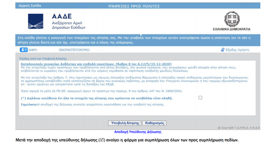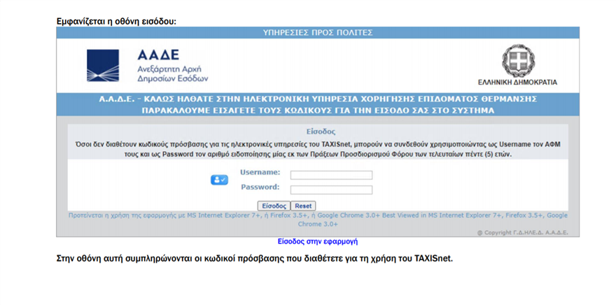 Διευκρινίζεται ότι οι καταναλωτές πετρελαίου θέρμανσης δεν απαιτείται να υποβάλουν παραστατικά αγοράς, διότι η διασταύρωση αυτών γίνεται αυτόματα. Η είσοδος στην πλατφόρμα γίνεται με τους κωδικούς πρόσβασης του taxisnet.