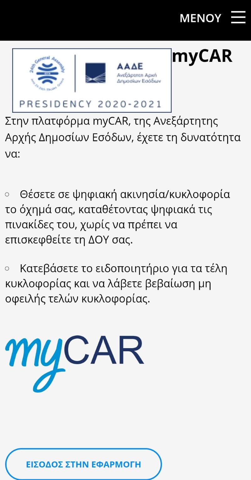 Η πλατφόρμα για τη ψηφιακή κατάθεση πινακίδων και την απαλλαγή από τα τέλη κυκλοφορίας βρίσκεται στη διεύθυνση MyCar.aade.gov.gr. Η είσοδος στην πλατφόρμα γίνεται με τη χρήση του username και του κωδικού των υπηρεσιών TaxisNet.