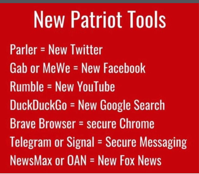 Παρακάτω ένας κατάλογος που δημοσιεύθηκε σε αμερικανικές δεξιές ιστοσελίδες που καθοδηγεί τους Αμερικανούς πολίτες σε εναλλακτικούς παρόχους εν μέσω της πολιτικής τρικυμίας που πλήττει την χώρα, με δημοφιλέστερο, μέχρι τώρα, όλων το Telegram: