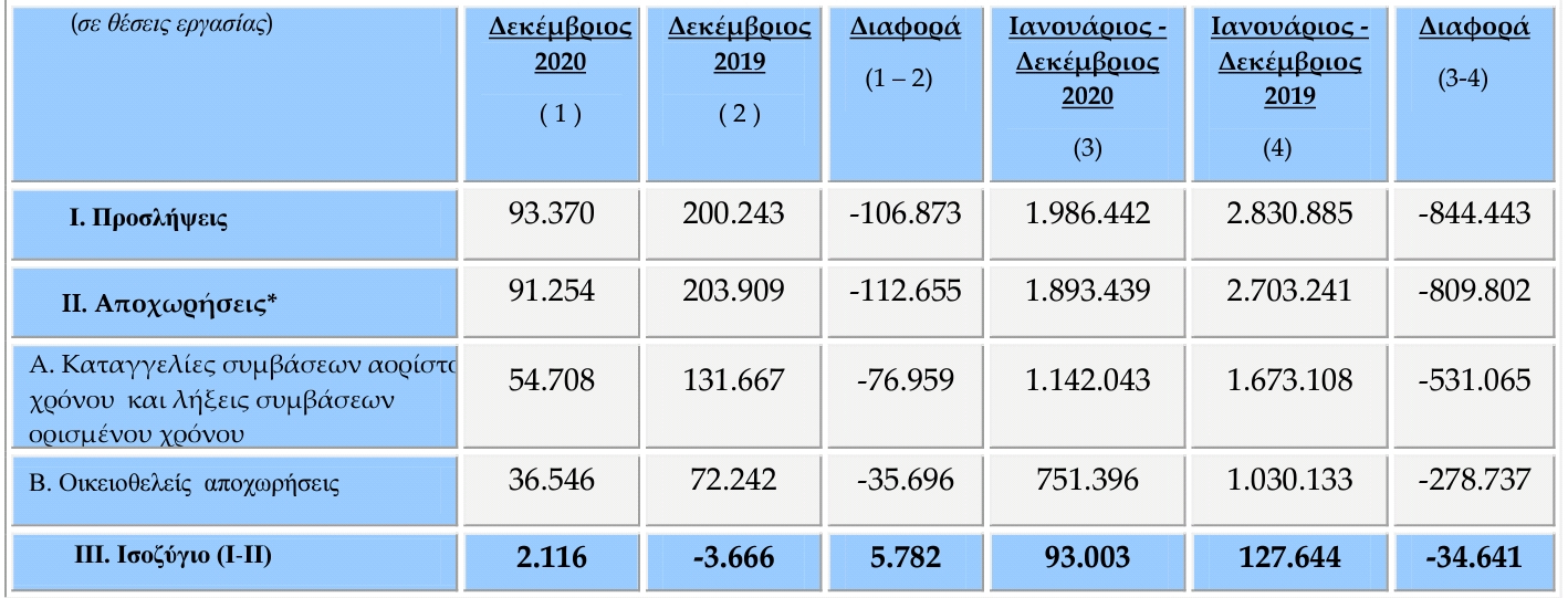​Οι προσλήψεις στη διάρκεια του 2020 έφτασαν στις 1.986.442 και μάλιστα σε συνθήκες πρωτοφανούς κρίσης. Παραταύτα υπολείπονται κατά περίπου 844.000 από τις αντίστοιχες του 2019 κι αυτό μοιάζει λογικό.