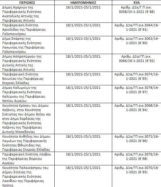 Επιπρόσθετα των όσων ισχύουν σε όλη την επικράτεια (βλ. ανωτέρω), σε περιοχές που έχουν επιβληθεί έκτακτα μέτρα προστασίας της δημόσιας υγείας σύμφωνα με τις σχετικές κοινές υπουργικές αποφάσεις που έχουν εκδοθεί προς αντιμετώπιση της διασποράς του κορωνοϊού COVID-19 αναφορικά με την αναστολή λειτουργίας των ιδιωτικών επιχειρήσεων που έχουν έδρα ή υποκατάστημα για το χρονικό διάστημα 18/1/2021 έως 25/1/2021 (και για τον Δήμο Αχαρνών από 16/1/2021 έως 25/1/2021) ισχύουν τα ακόλουθα: