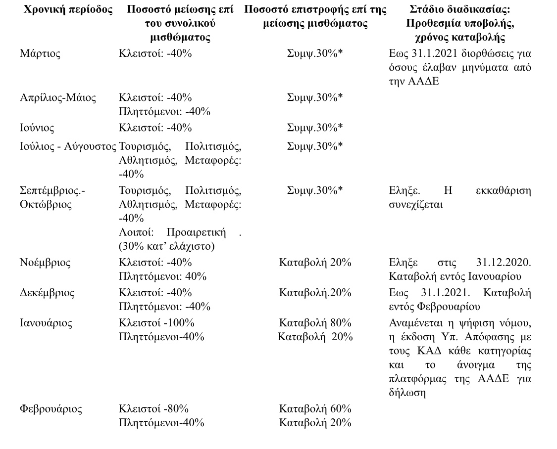 Το αρχικό ποσοστό του ποσού 30% επί της μείωσης, συμψηφιζόμενου με τρέχουσες φορολογικές υποχρεώσεις, αυξήθηκε σε καταβολή του 50%, το οποίο είχε εξ αρχής διεκδικήσει η ΠΟΜΙΔΑ και θα φθάσει ακόμη και σε ποσοστό έως και 80% για τους μήνες Ιανουάριο και Φεβρουάριο 2021 στις επιχειρήσεις που παρέμειναν κλειστές με κρατική εντολή. Για όσους φορολογούμενους δικαιούνται συμψηφισμό με τις φορολογικές τους υποχρεώσεις πλην όμως έχουν ήδη εξοφλήσει πλήρως Φόρο Εισοδήματος και ΕΝΦΙΑ, ο συμψηφισμός θα γίνει με τις υποχρεώσεις του επομένου οικονομικού έτους.