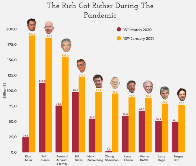 Αύξησαν τα κέρδη του κατακόρυφα οι δέκα πιο πλούσιοι άνθρωποι στον πλανήτη κατά τη διάρκεια της πανδημίας του COCID-19 σύμφωνα με τα στοιχεία για τα κέρδη τους. Όπως φαίνεται στο σχετικό διάγραμμα από τις 13 Μαρτίου του 2020 έως και τις 10 Ιανουαρίου 2021 οι πλουσιότεροι άνθρωποι στον κόσμο έγιναν ακόμη πιο πλούσιοι.