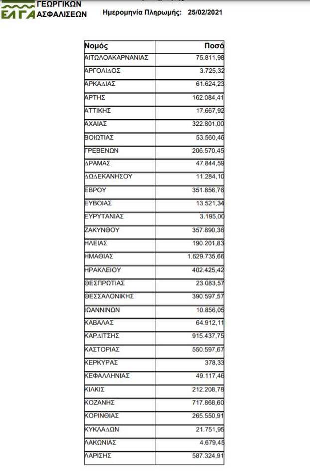 Αύριο Πέμπτη 25 Φεβρουαρίου θα γίνει η πληρωμή αποζημιώσεων για τα 14,7 εκατ. ευρώ από τον ΕΛΓΑ.