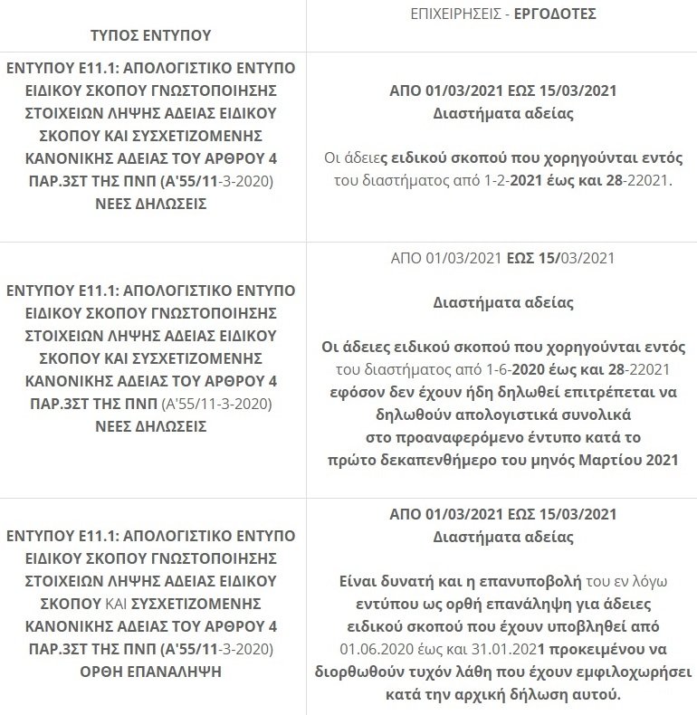Δίνεται η δυνατότητα υποβολής του εντύπου Ε11.1 για τις άδειες ειδικού σκοπού, έως τις 15/3/2021 προκειμένου να δηλωθούν διαστήματα αδείας από 1/6/2020 έως και 28/2/2021 εφόσον δεν έχουν ήδη δηλωθεί.
