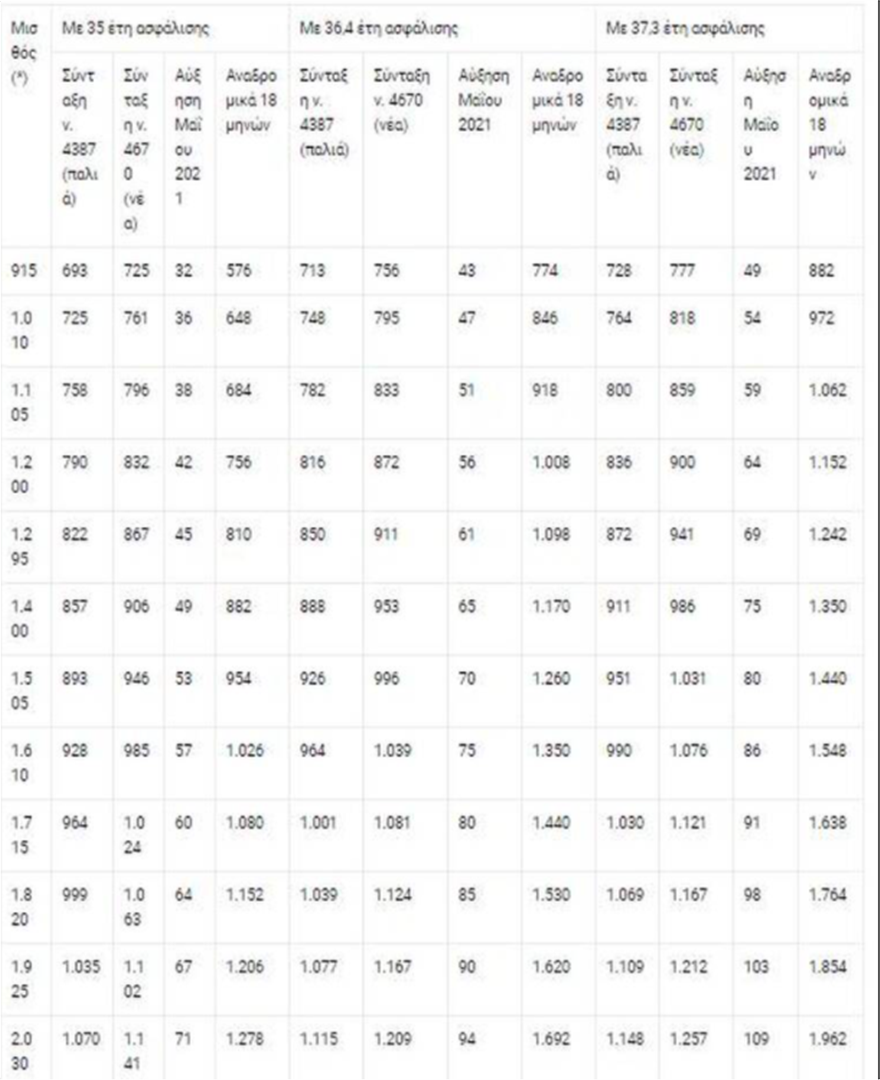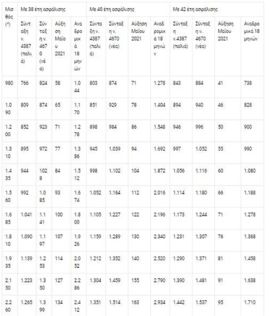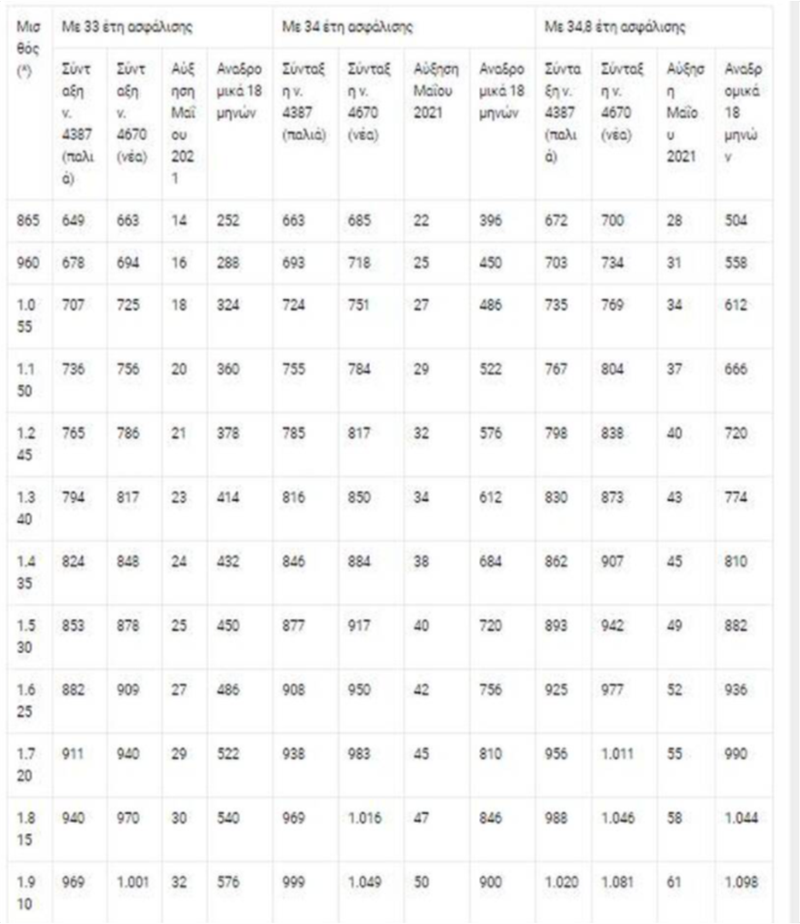 Επίσης, στους πίνακες περιλαμβάνονται οι συντάξεις με το νόμο 4387 (παλιά σύνταξη), ο επανυπολογισμός με το νόμο 4670 (νέα σύνταξη), η αύξηση και τα αναδρομικά για συνταξιούχους με 33 ως 42 έτη ασφάλισης και για μισθούς από 865 ευρώ ως 2.650 ευρώ.