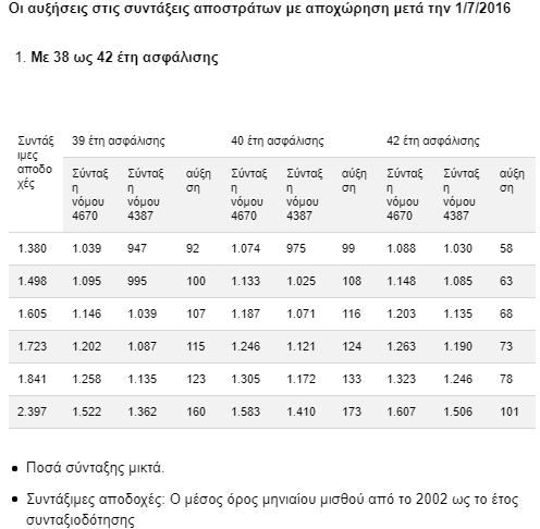 Τα δύο συστήματα (νόμου 4670 και 4387) καταλήγουν σε «ισοπαλία» στα 44 έτη και 9 μήνες ασφάλισης. Από τα 44 έτη και 10 μήνες υπερτερούν τα ποσοστά αναπλήρωσης του νόμου 4387, πλην όμως η κυβέρνηση προέβλεψε με ειδική διάταξη να ισχύει προσαύξηση 2% κατ’ έτος από το 45ο έτος και μετά για τους απόστρατους, ώστε να μην έχουν απώλειες.