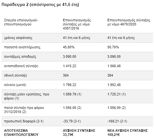 Τη μεγαλύτερη αύξηση την έχουν όσοι αποστρατεύτηκαν με 40 έτη, όπου ο νέος συντελεστής υπολογισμού της ανταποδοτικής σύνταξης με το νόμο 4670/2020 είναι ίσος με το 50,01% του μισθού, έναντι 42,80% με τον παλιό νόμο (4387/2016). Μετά τα 40 έτη ο νέος νόμος δίνει όμως μικρή προσαύξηση (0,5% κατ’ έτος) έναντι 2% που έδινε ο παλιός.