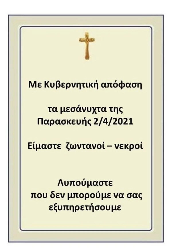 Με τίτλο «Όχι άλλο εμπαιγμό – Να ανοίξουν τώρα τα μαγαζιά μας» η ανακοίνωση του Εμπορικού και Εισαγωγικού Συλλόγου Πάτρας συνοδεύεται και από ένα κηδειόχαρτο στο οποίο αναγράφεται ότι «με κυβερνητική απόφαση τα μεσάνυχτα της Παρασκευής 2/4, είμαστε ζωντανοί-νεκροί. Λυπούμαστε που δεν μπορούμε να σας εξυπηρετήσουμε».